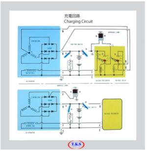 イグニション・スイッチ、接点等を作動させる事により、充電回路のイグニション・スイッチを閉じた状態、エンジンの高速、低速の各回転時における発生電圧の制御等が、理解できます。