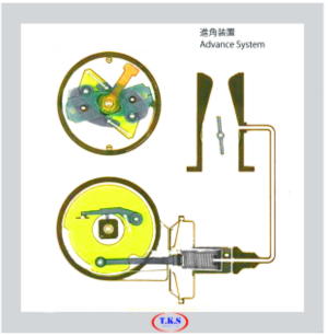 遠心式ガバナは、ウェイト上のピンを作動させる事により理解され、アドバンサ・ロッド上のピンを作動させる事によりバキューム・アドバンサの作動が理解できます。