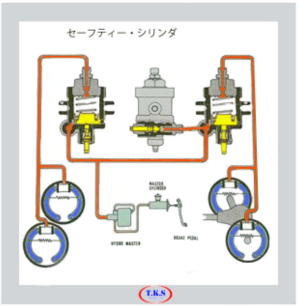 セフティ・シリンダの作動を説明するためのもので、ピストン、開閉バルブ、エア抜きバルブ、が作動することによりブレーキの油漏れを防止するセフティ・シリンダ機構が容易に理解できます。