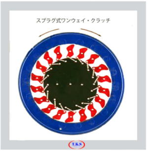 スプラグ式ワンウェイクラッチの作動を説明するためのもので、インナレースとアウタレースとの間に設けたスプラグの動きにより一方向しか回転しないワンウェイクラッチの特性が容易に理解できます。