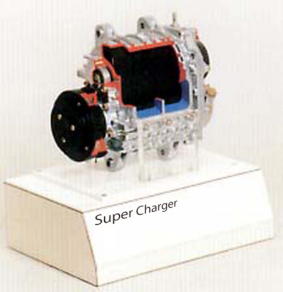 スーパー・チャージャーのカット・モデルです。 ドリブン・ロータ、ドライブ・ロータ、電磁クラッチ、等が観察できます。