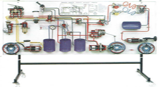 トレーラートラックの油圧空気圧の圧縮空気ブレーキシステムです。接続ホースは異なった回路別に着色されています。エア・コンプレッサ、プレッシャ・レギュレータ、エア・タンク、エア・ブレーキ・バルブ、ドラム・ブレーキ、等の学習ができます。