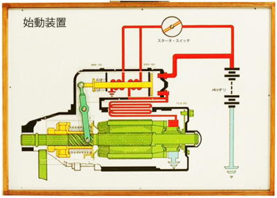 スタータの作動原理を説明するためのもので、シフト・レバー、オーバランニング・クラッチ、ピニオン、プランジャ等を作動させる事によりバッテリからの電流がプルインコイル、アーマチュア・コイルおよびホールディング・コイルに流れ、この磁力によりプランジャが右方に動かされ、シフトレバーを通じピニオンを押し出してリング・ギヤに噛み合う様子が説明できます。