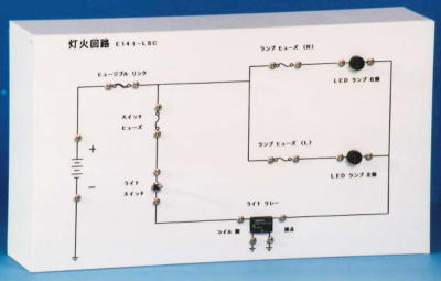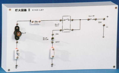 E141-LST 灯火回路のトラブルを解明するための実習教材で回路状に断線個所を設け、そこに付属の抵抗などをセットして正常時、故障時の電圧を測定する事にとり故障の見分け型が理解できます。 電源内臓:5V(単3 乾電池3 個)