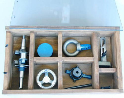 内容:透明プラスチックふた付木製ケースに、クランクシャフト、プーリ、ハンドル、アイ・ボルト、かみあい・クラッチ、トースカン、豆ジャッキ等が収納されています。