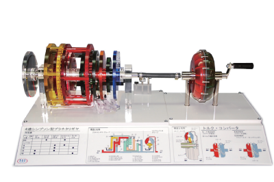 シンプソン型プラネタリ・ギヤ・ユニット模型に、トルクコンバータを組み合わ せた、より実車に近い形でのモデルです。トルクコンバータのハンドルを回転させると内部の流体が動き、タービンランナが回転を始め動力が伝達されま す。設定した変速のギヤの働きが目視でき、出力プレートの回転差を見ることによって一定の入力回転でも変速によって出力回転が変化する様が容易に 目視できます。