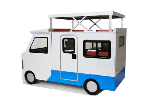 車体は全て解放できます。伸縮式の屋根を伸ばせば二階にベッドができます。