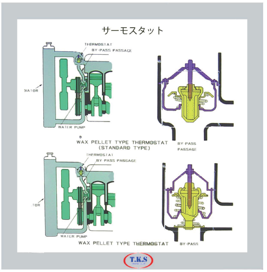 The creeping move of chilled water is called off to the side of the radiator by operating the architecture and the coolant thermostat of the coolant thermostat in the one to explain a standard model and of the bypass valve 付 of, two kinds wax pellet configuration coolant thermostats and the device which is adjusting a cooling water temperature can be understood.
