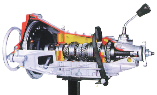 By the cut total vehicle of the clutch and the 5-speed gearbox, a helical gear, a selector slider, a speed fork, equal が are seen.