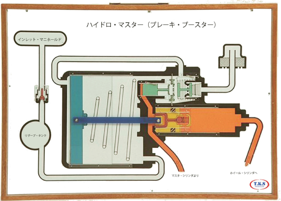 When pushing a power piston on the right, a direct hydraulic piston is pushed by the push-rod and the oil route of the master cylinder and the oil barrel cylinder is cut off by the residual-valve.