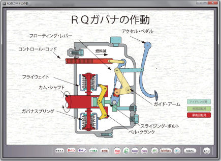The fuel-system, the sequence type injection pump, the construction of the RQ configuration centrifugal-spark-advancer, the flyweight governor weight and the governor-spring, the actuation of the floating beam