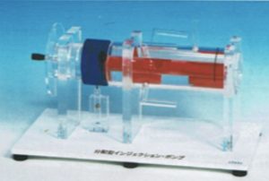 この分配型インジェクション・ポンプは、一本のプランジャによって燃料を各シリンダに供給しているポンプの特徴が一目で理解できます。 ディストリビュータ・ヘッド部分の構造と機能の説明ができます。ディストリビュータ・ヘッドはカム・ディスク、コントロール・スリーブ、ディストリビュータ・バレル、プランジャ等で構成されています。カム・ディスクを回転または押したり引いたりすることによりプランジャは動きます。コントロール・スリーブは左右に作動させることにより燃料の噴射量を調節することができます。 これらの作動により燃料の噴射量の調節、プランジャの吸入行程、噴射行程、噴射終わり、均圧行程、等の説明ができます。
