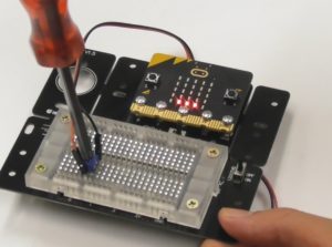 半固定抵抗を回すことで変化する電圧をマイクロビットが読み取り、LEDの表示を変化させます。